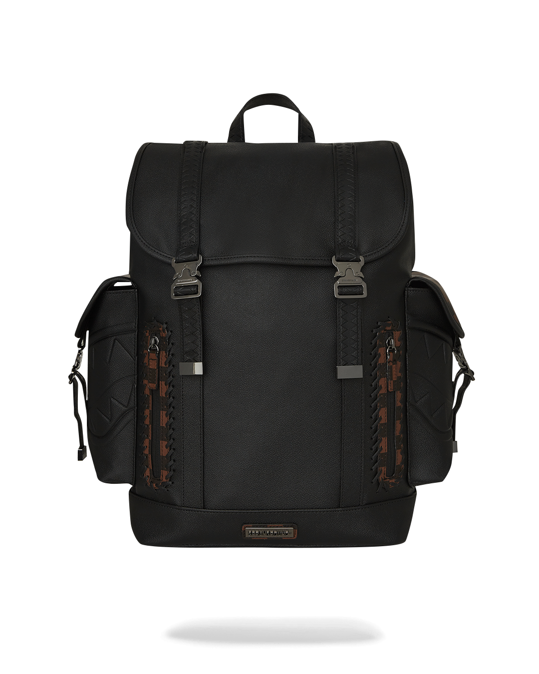 PVC bag with embossed details such as the sharkmouth and zipper pullers. Sewn faux leather details around the front zipper pocket.